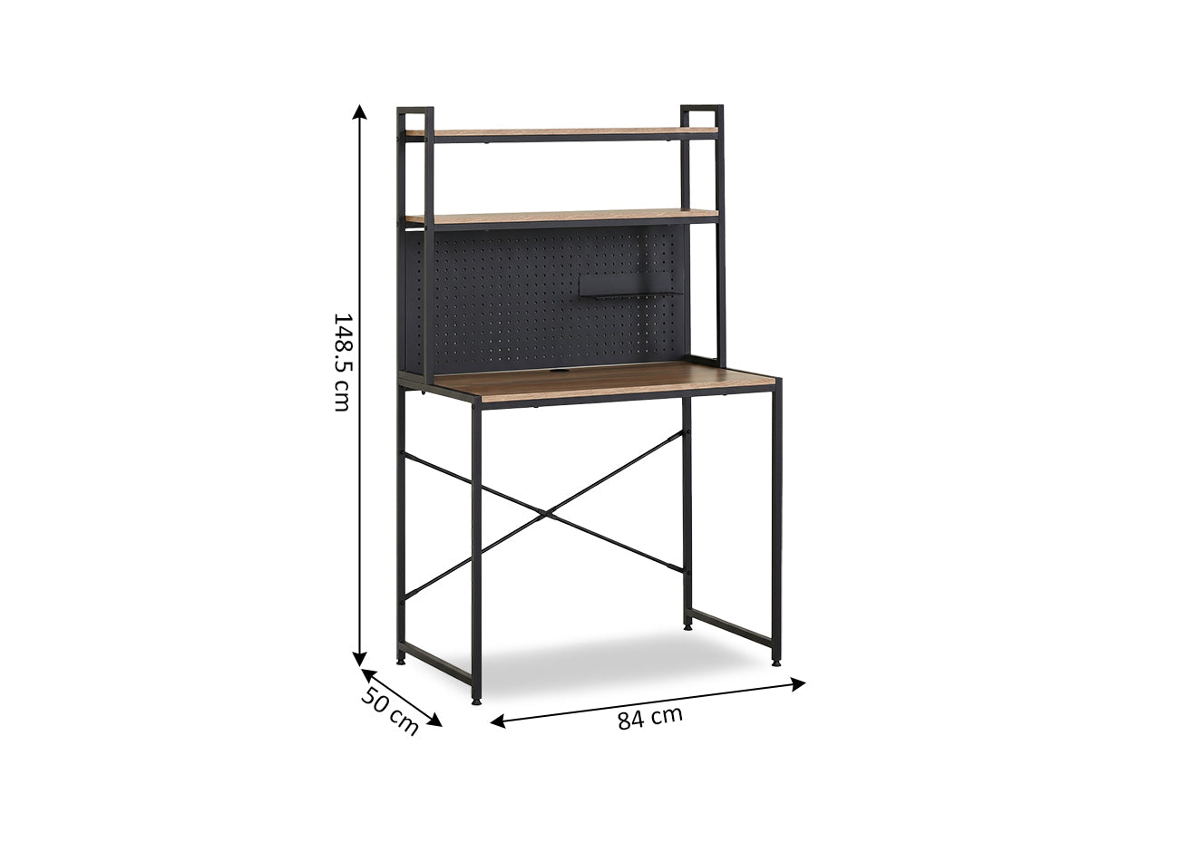 Este escritorio de oficina y home office de diseño industrial moderno es la solución ideal para el trabajo, los estudios y el ordenador. Su estructura metálica robusta cuenta con una amplia superficie y estantes superiores que maximizan el almacenaje, siendo perfecto para optimizar espacios pequeños o grandes. El diseño versátil incluye un panel perforado para accesorios, combinando funcionalidad y estilo contemporáneo en cualquier zona de estudio o decoración interior. Fácil montaje.